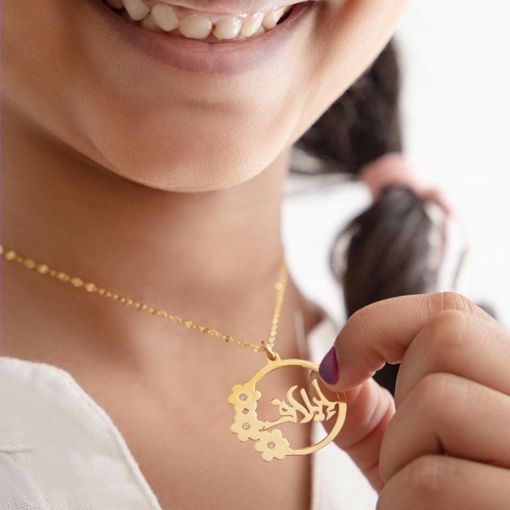 عقد بتصميم الإسم مع إضافة الورد مزيّن بالكريستال يتم صياغة الاسم حسب طلبك .. وذلك بأيدي صائغين مهرة في المصنع الخاص بـ سوفتيل..