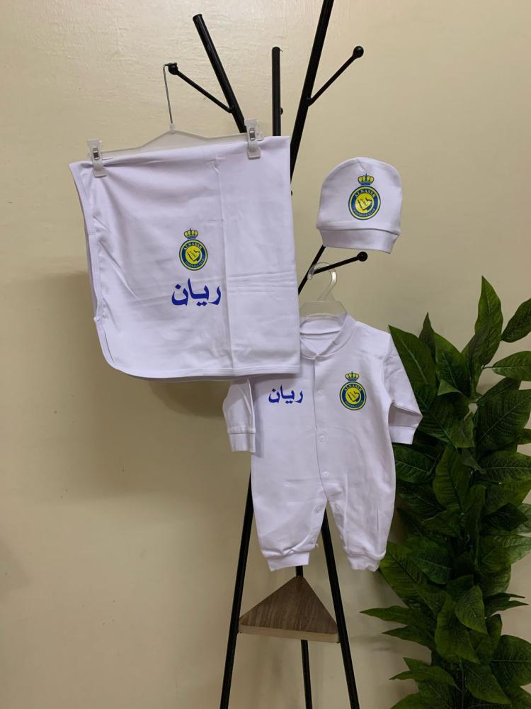 احصلي لطفلكِ على أجمل بربتوز مواليد بشعار نادي النصر السعودي. طقم مواليد أصلي مكوّن من بربتوز، قبعة وبطانية، بجودة عالية ولون أبيض أنيق يليق بمشجعي النصر الصغار. تصميم مريح للخروج أو هدية مميزة لمشجع نصرواي جديد. خامة قطنية ناعمة، شعار النصر مطبوع بجودة عالية. مثالي لعشاق الزعيم الباحثين عن أطقم مواليد بشعار النصر الأصلي.