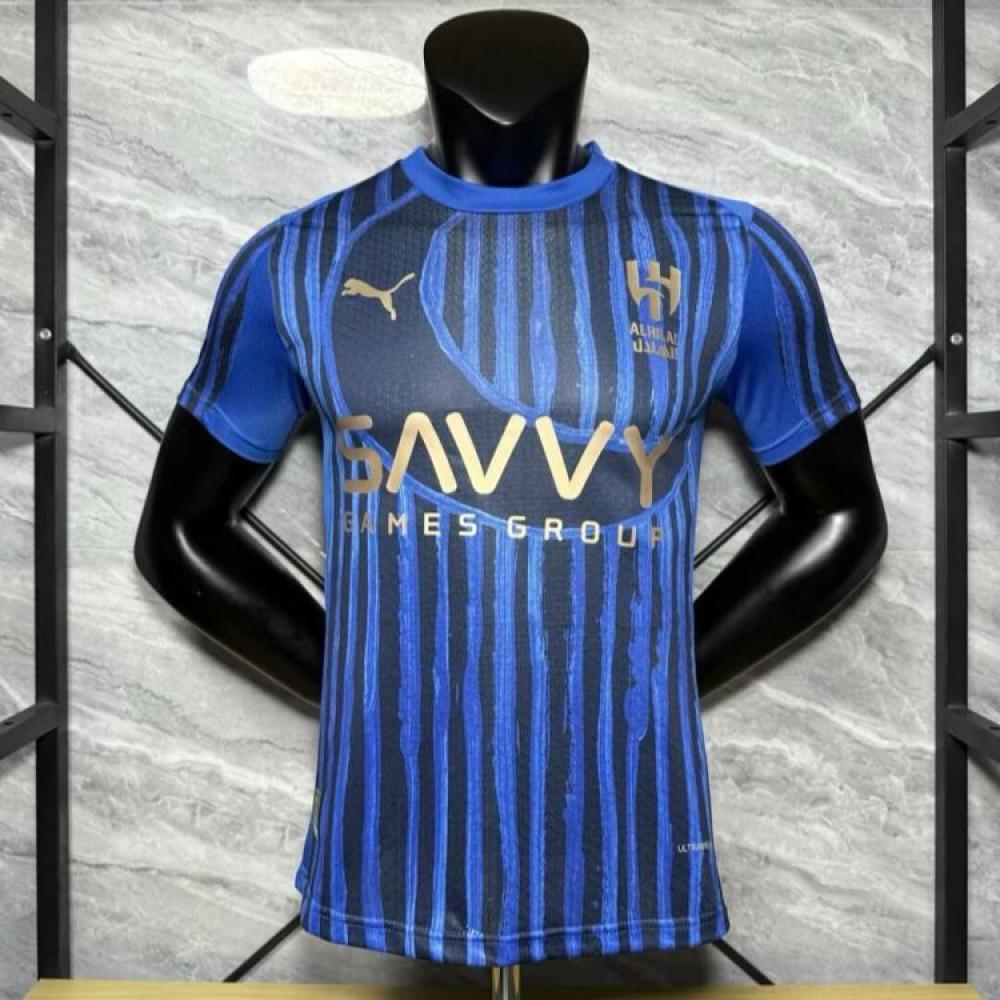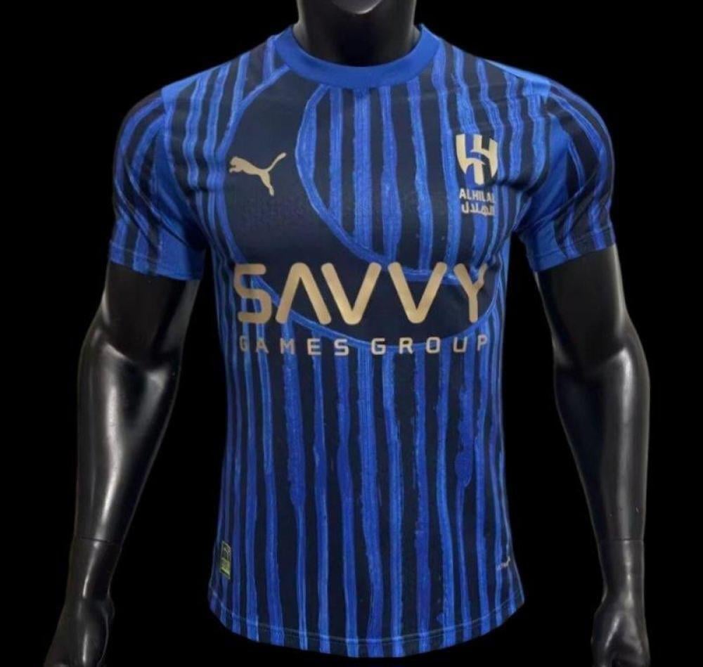 يتميز التيشيرت بخطوط زرقاء نابضة بالحياة، وشعار الهلال المطرّز بدقة،